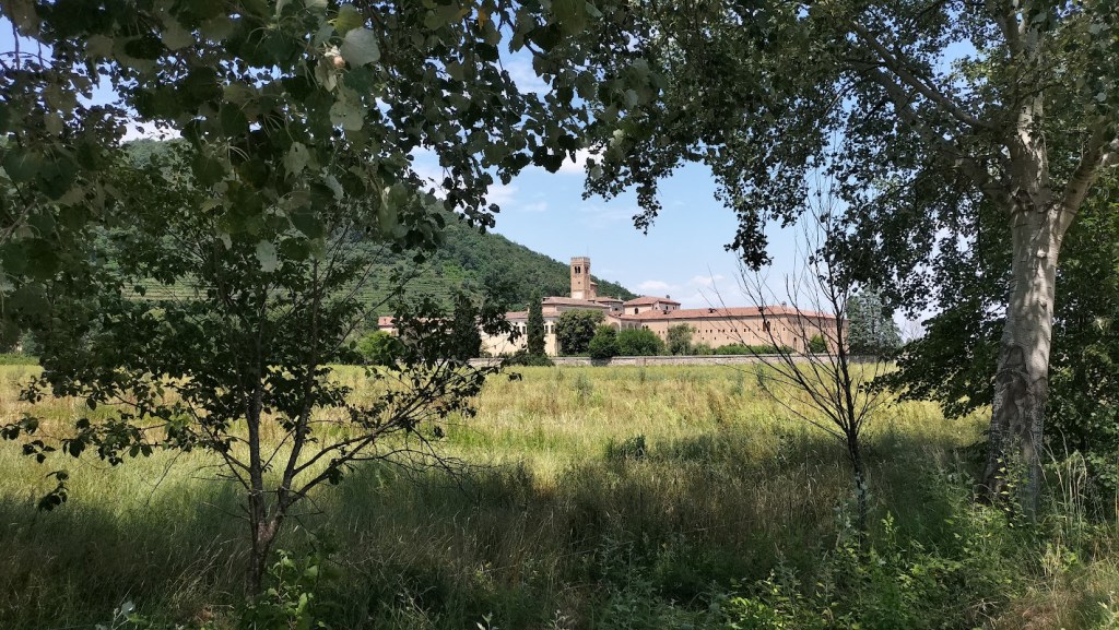 Decidiamo per tagliare il percorso (un taglio di 19 km sul percorso totale, chiudendo con 141, anziché 160 previsti). Risaliamo verso Monticello, prendendo una deviazione interna su sentiero da MTB pura. Il fondo troppo scivoloso, ci costringe a spingere le bici a mano e tra imprecazioni (verso Google Maps) e maledizioni varie, riusciamo a tornare sulla strada.