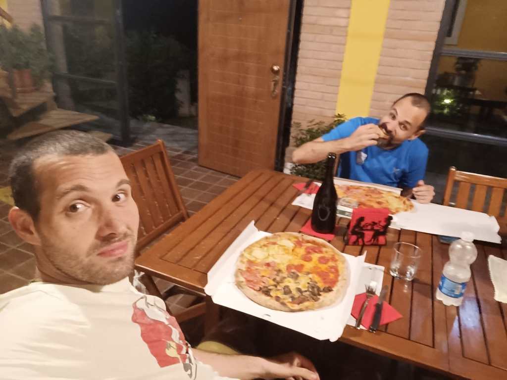 Tempo una doccia veloce e Mario ci fa trovare le pizze calde sul tavolo e una bottiglia di ottimo vino, prodotto dal fratello. Lo invitiamo a sedersi con noi, accetta e scambiamo quattro chiacchiere, raccontando la giornata.